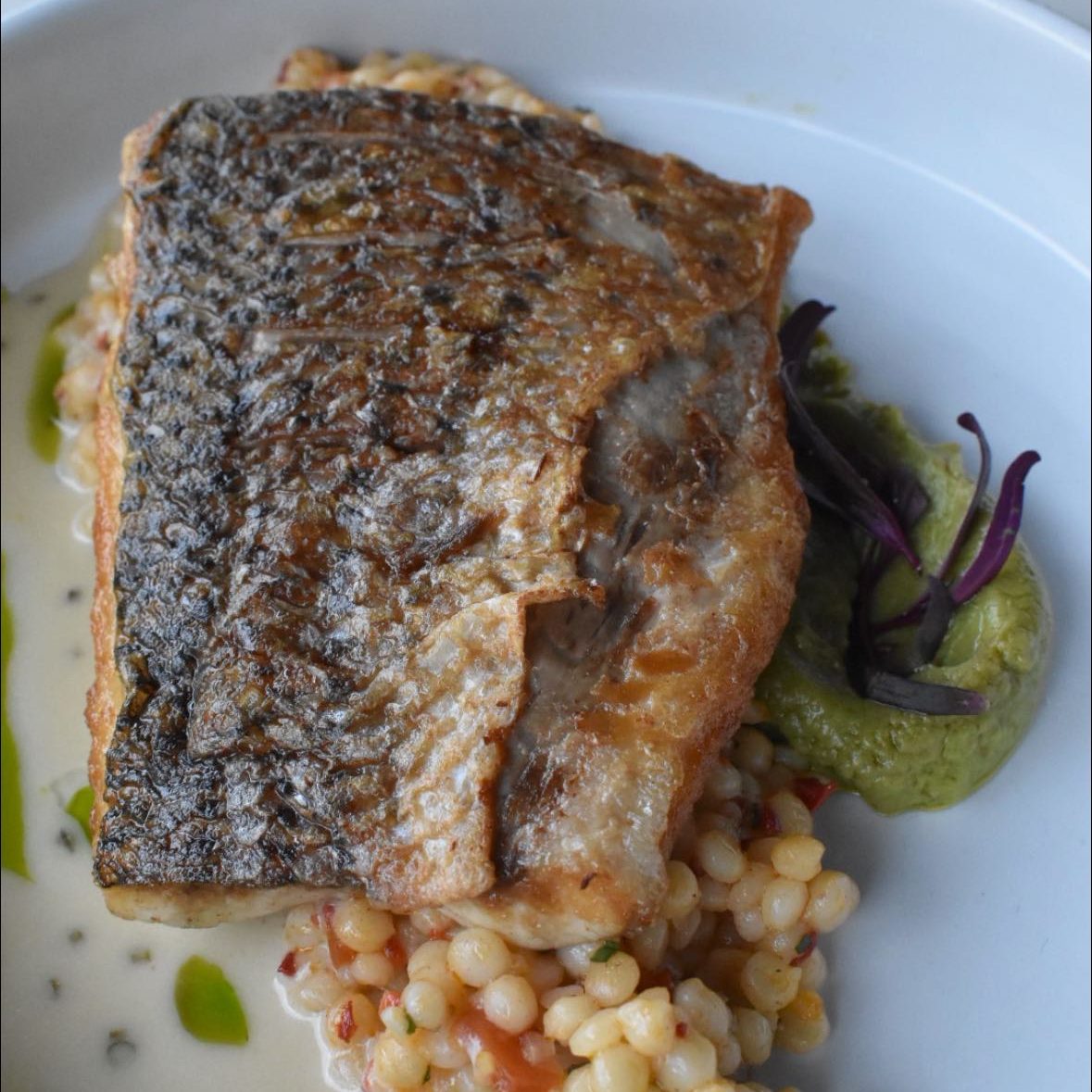 Our entrées brought a different mood: Pacifico Striped Bass, bright and fun, perched on Israeli couscous, with a whisper that wants to tell you what love is. The brown butter vinaigrette, earthy without heaviness, really does “make it sing.” It wasn’t just a dish—it was a conversation in flavor, cheerful and complete.